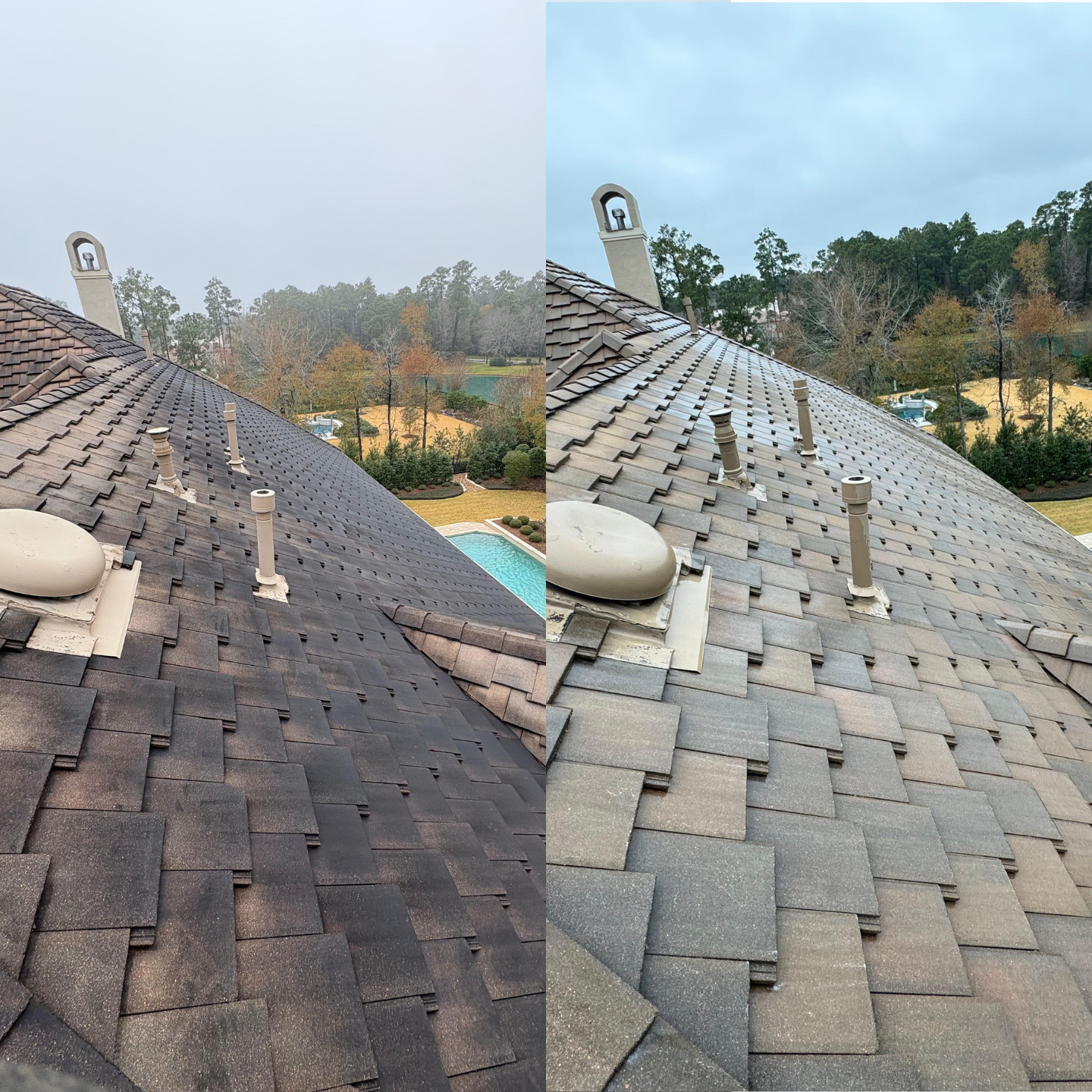 Our roof washing service uses a soft wash technique to safely and effectively remove dirt, moss, algae, and other buildup from your roof.